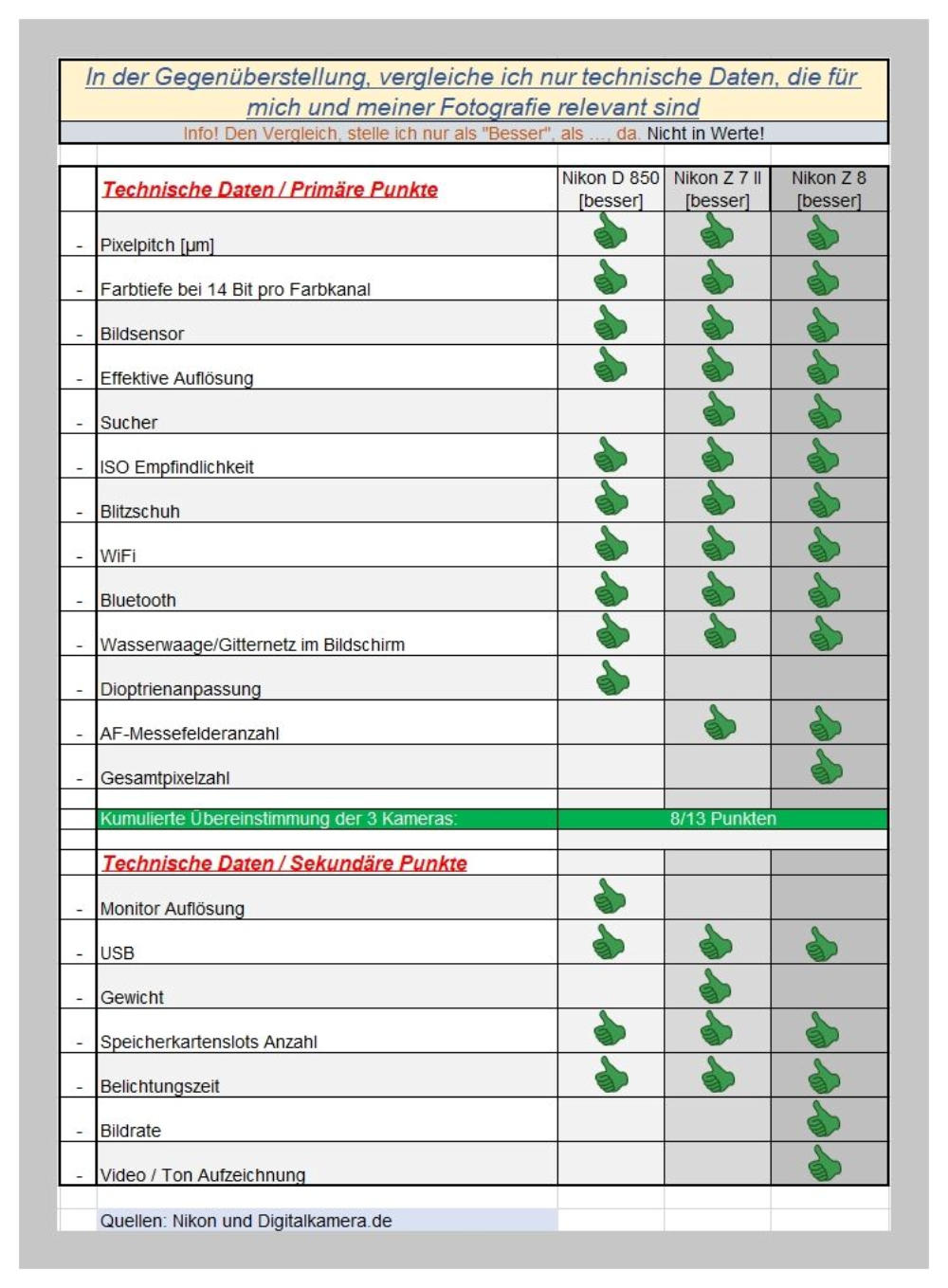 Mein persönlicher Vergleich meiner Nikon D850 mit der Z 7II und der Z 8Sehr lange habe ich den Gedanken, meine o. g. Kamera mal mit dem Spiegellosen-System von Nikon zu vergleichen.Jetzt hatte ich die Lust und abends die Zeit, mich damit zu beschäftigen. Mein 1. Step. war, mir eine Liste zu machen, was für mich und meiner Fotografie, bzgl. der Daten in der Spezifikation angeht zusammen zustellen. Der 2 Step. war dann,diese Daten dem Z-System gegenüber zustellen. In der tabellarischen Gegenüberstellung, wollte ich keine Zahlen vergleichen, sondern nur, welche Kamera in dem jeweiligen Punkt die Bessere ist. Damit möchte ich das Ganze übersichtlich abbilden. Die Punkte habe ich noch in primäre und sekundäre Punkte unterteilt. Jetzt möchte ich nicht weiter in techn. Details abschweifen. Alles relevante habe ich im Video dargestellt und erklärt.Mein erstes Fazit, aus dem Vergleich mit den technischen Daten der 3 Kameras, lässt mich persönlich, für meine Bedürfnisse und Fotografie zu dem ersten Fazit kommen, dass ich, wie im Video schon gesagt, zu dem Ergebnis kommen, dass ich keinen Mehrwert von dem Spiegellosen System, zum Spiegelreflex System sehe.Meine subjektives Ergebnis, habe ich noch mit versch. Messdaten, die für mich relevant sind in einer Webseite verglichen und untermauert.Im zweiten Teil, werde ich mir die Nikon Z8 mit FTZ-Adapter leihen und noch in der Praxis vergleichen.Das Ergebnis wird im Mai kommen! Quellen-Angabe der 3 Grafiken: www.photonstophotos.net- Video- Webseite zum technischen Vergleich
